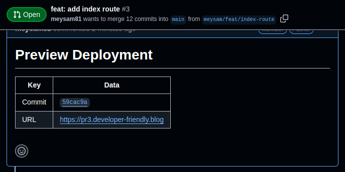 One last objective before we close this off. Let's comment on the corresponding pull request the URL of the preview environment.