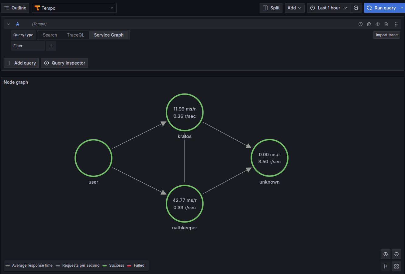 Alloy, just like OpenTelemery Collector, is able to ship service graph data to Prometheus-compatible endpoints, allowing us to view the graph of our services in the Tempo backend.